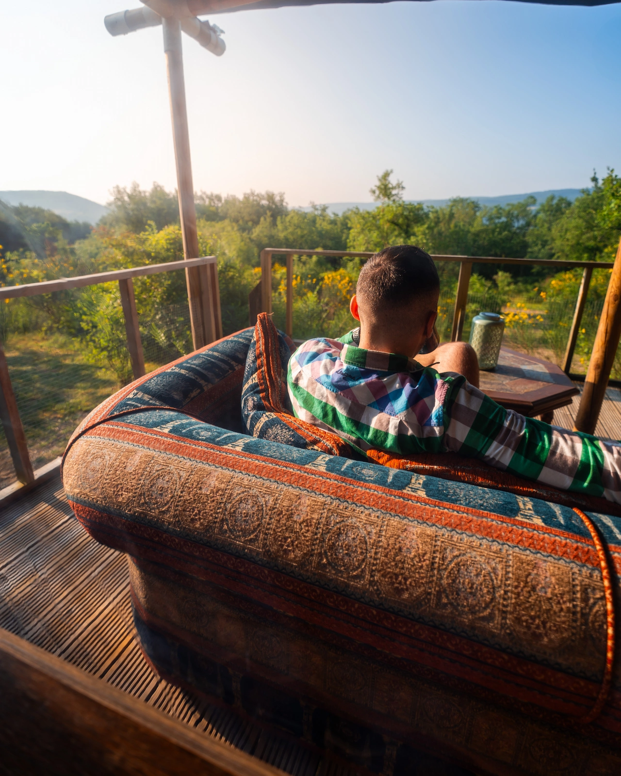 Chrysalide est un lodge tout neuf qui se distingue des autres lodges du Camp avec ses cloisons toilées qui délimitent trois espaces nuits : deux chambres avec chacune un lit simple et dans l’espace principal un lit queen-size. L’éclairage doux crée une atmosphère douce propice au repos et à la détente. La terrasse abritée offre quant à elle une magnifique vue dégagée sur la vallée et ne présente pas de vis-à-vis : un espace zen, pour chiller et se ressourcer. Les sanitaires sont à proximité.