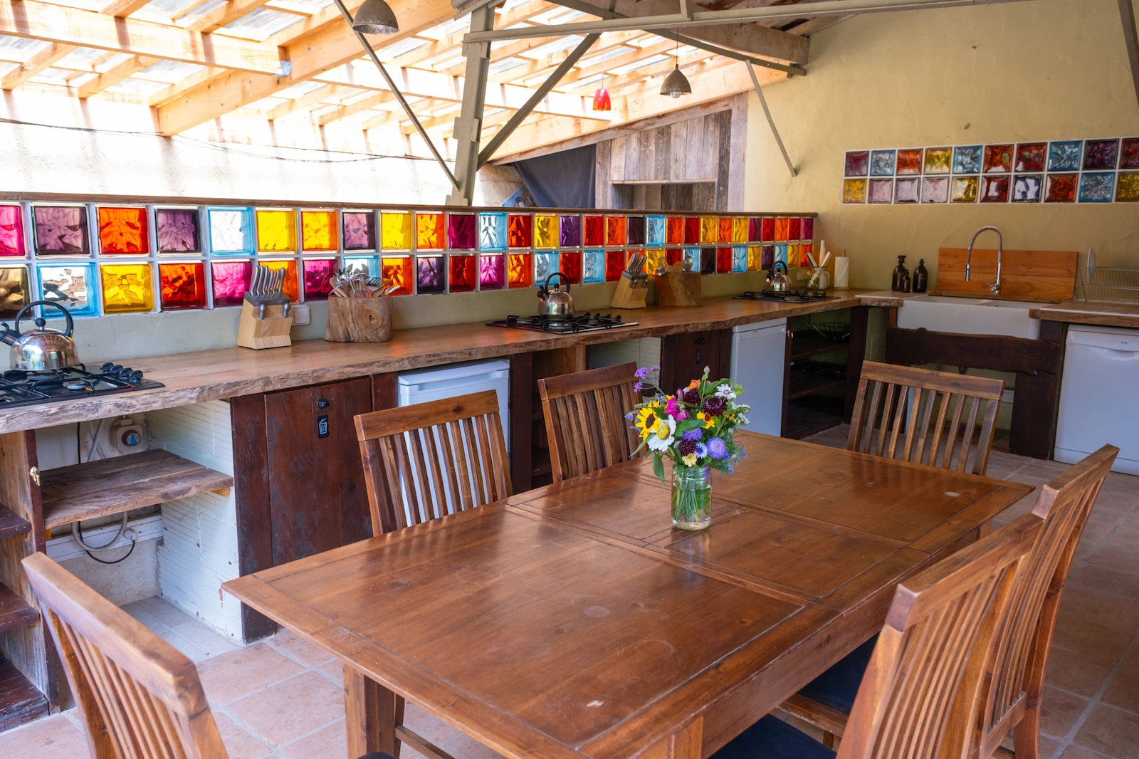 C’est d’abord un endroit de toute beauté avec sa mosaïque de carreaux de verre multicolores. En plein air mais couvert, cet espace combine 6 zones privatives (soit une par lodge des gammes Douce Nuit et Nid douillet) et du matériel commun aux 6 lodges : vaisselle, ustensiles de cuisine, petite épicerie de base, four, micro-ondes et lave-vaisselles . Eponges, torchons, essuie-mains, essuie-tout, liquide vaisselle, pastille pour le lave-vaisselle, pour votre tranquillité d’esprit, tout ceci vous est gracieusement fourni.