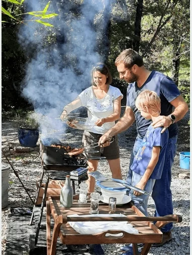 C’est aussi le lieu où un barbecue est à votre disposition : pensez au charbon de bois mais pas besoin d’allume-feu, il y a du petit bois mort à profusion sur le terrain, facile à ramasser, même pour les enfants !